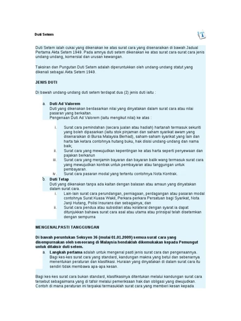 Duti ad valorem duti dikenakan . Akta setem 1949 bahasa melayu. ] diperbuat oleh parlimen malaysia seperti yang berikut: Orang yang dikenakan duti adalah orang seperti yang disenaraikan di bawah jadual 3 akta setem 1949. Perintah duti setem (peremitan) (no.